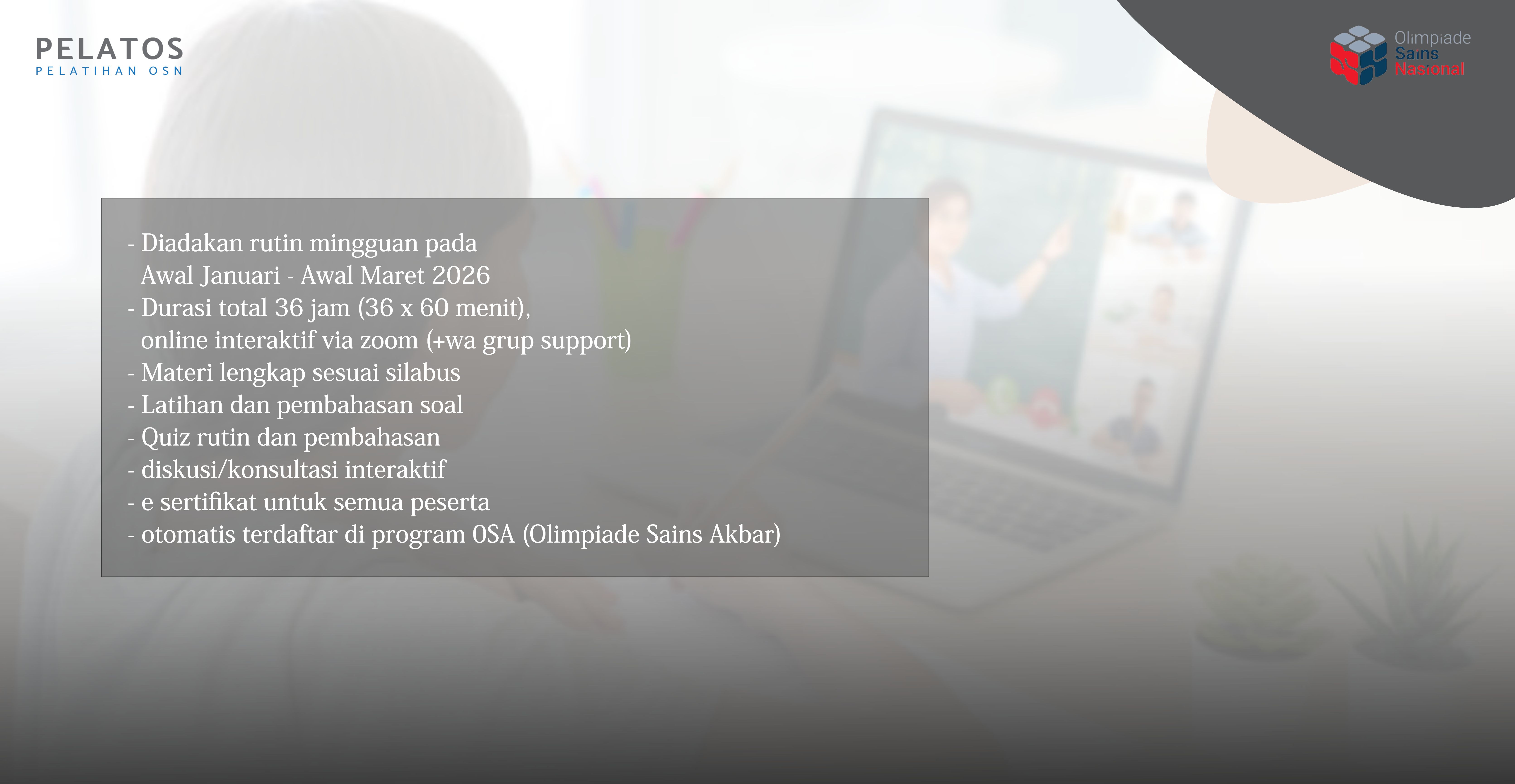 Dalam rangka persiapan menghadapi Olimpiade Sains Nasional tingkat Kota (OSN-K) 2026, kami membuka program Pelatihan Rutin Online Persiapan OSN-K 2026 tingkat SD, SMP dan SMA (level medium), berupa pembelajaran online interaktif rutin dan terjadwal yang dilakukan melalui aplikasi zoom. Peserta pelatihan ini juga akan otomatis terdaftar pada program Olimpiade Sains Akbar (OSA), yang dapat digunakan sebagai ajang uji coba kemampuan siswa sebelum OSN-K diadakan. Pada pelatihan ini akan diberikan materi-materi sesuai silabus OSN-K, pembahasan soal-soal, quiz evaluasi serta diskusi dan konsultasi dengan tim tentor berpengalaman.